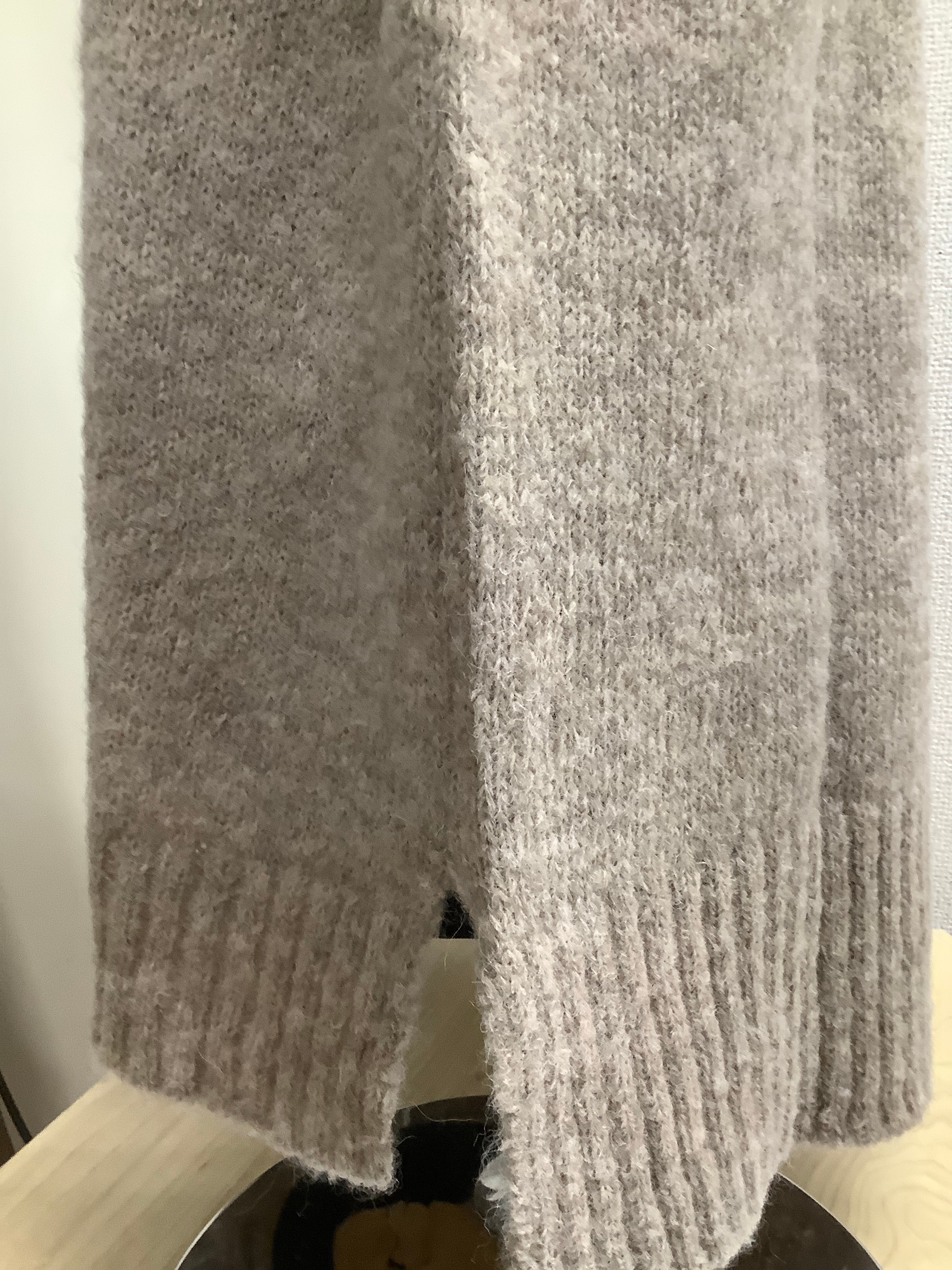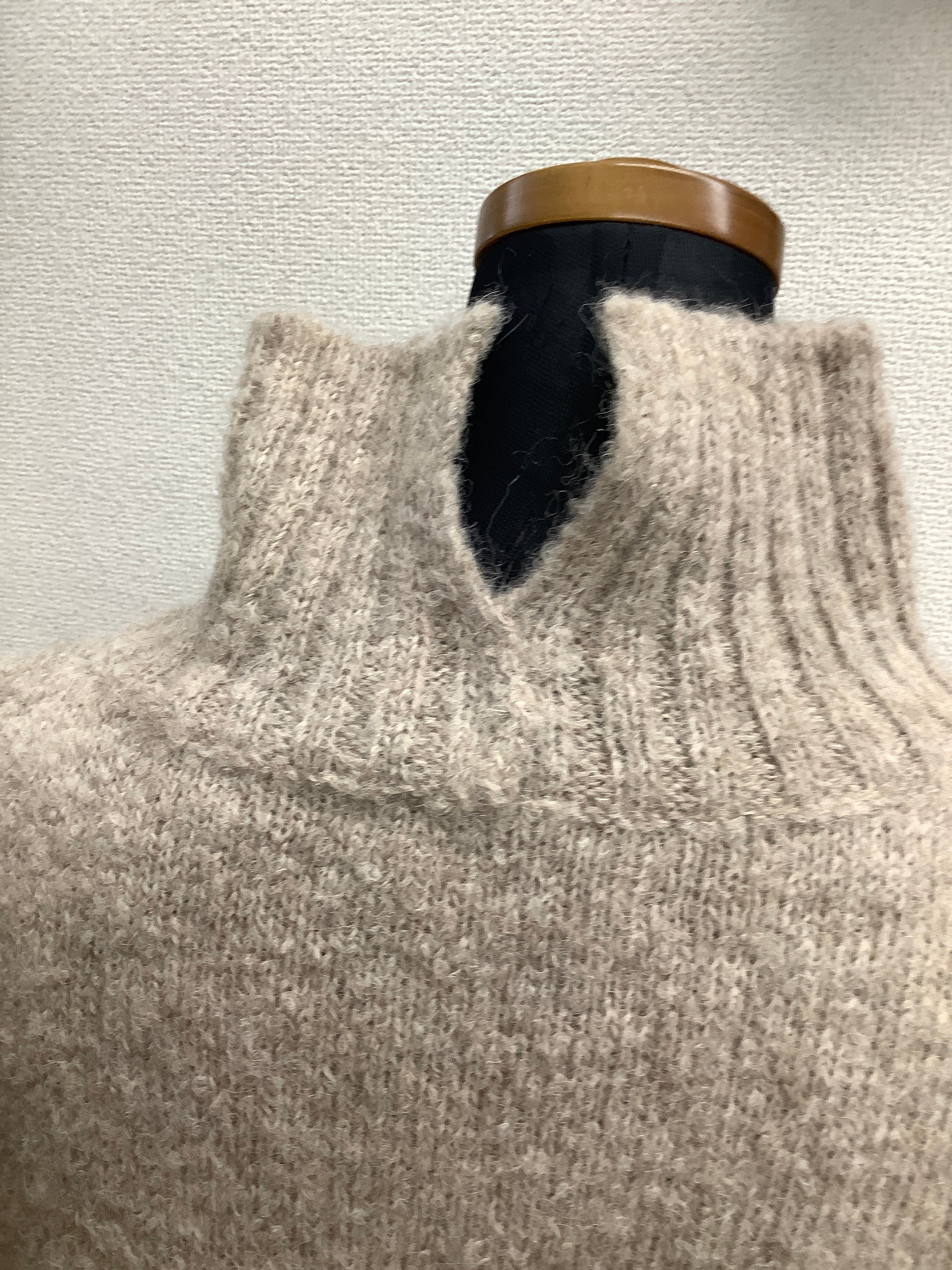ふわっとしたアルパカの毛糸を使用している為、軽くて温かいです。横にスリットがあるので座る時に楽です。首の後ろにもスリットが入っています。着脱時を考慮したデザインです。