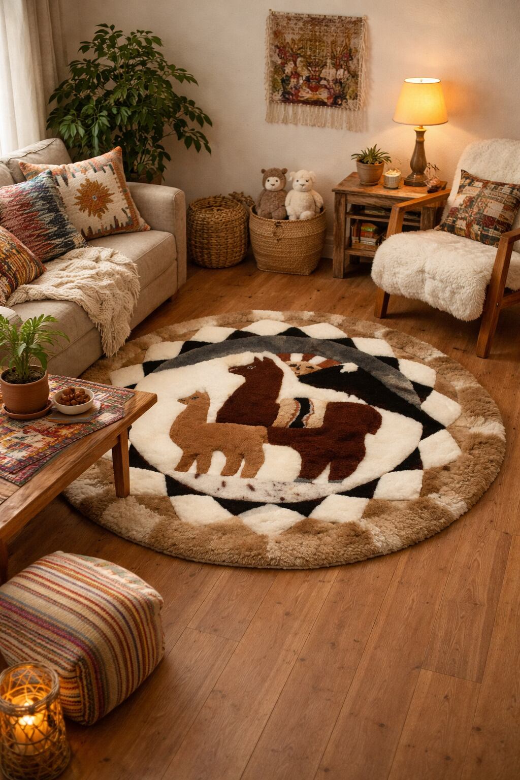 アルパカ純毛丸ラグ アルパカ2頭柄