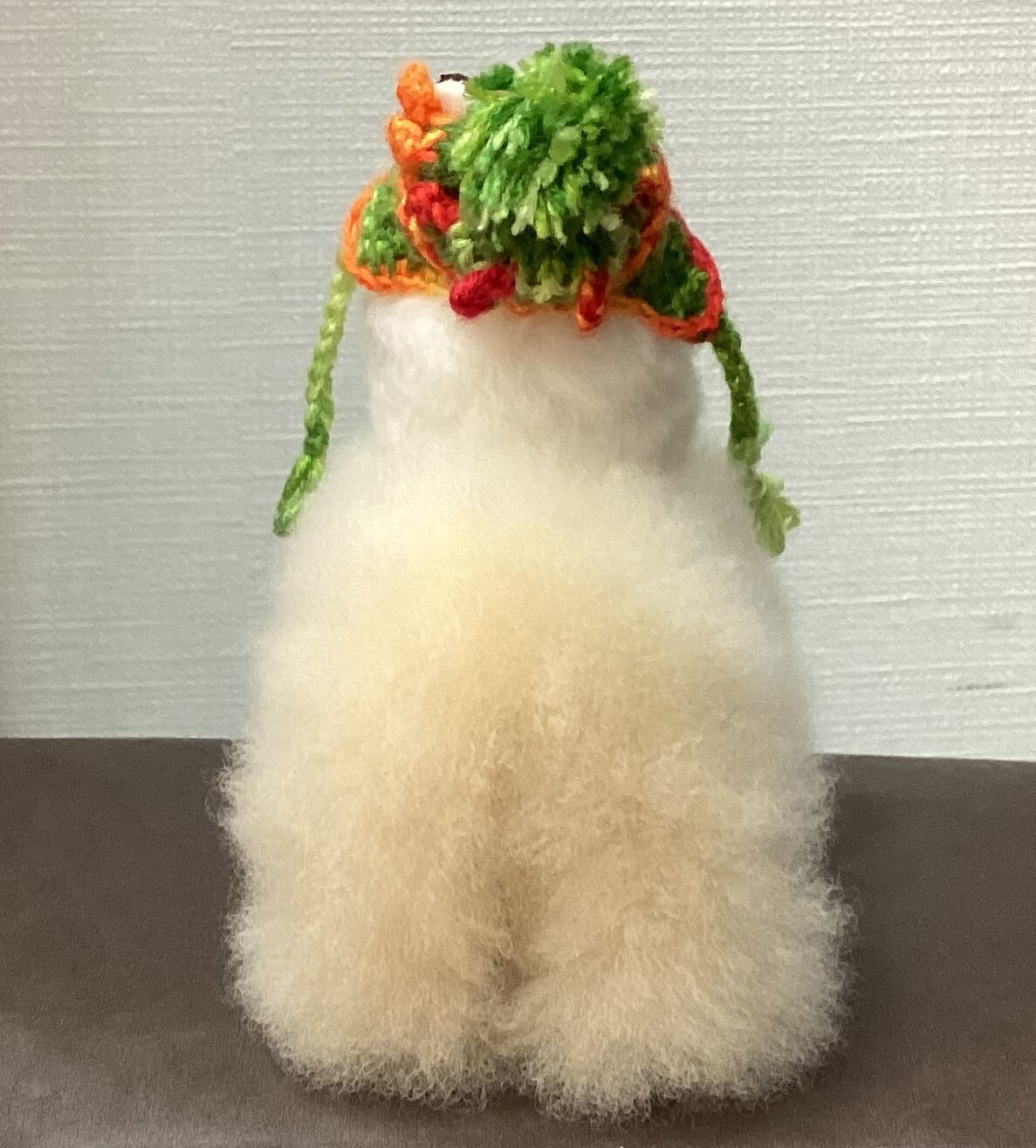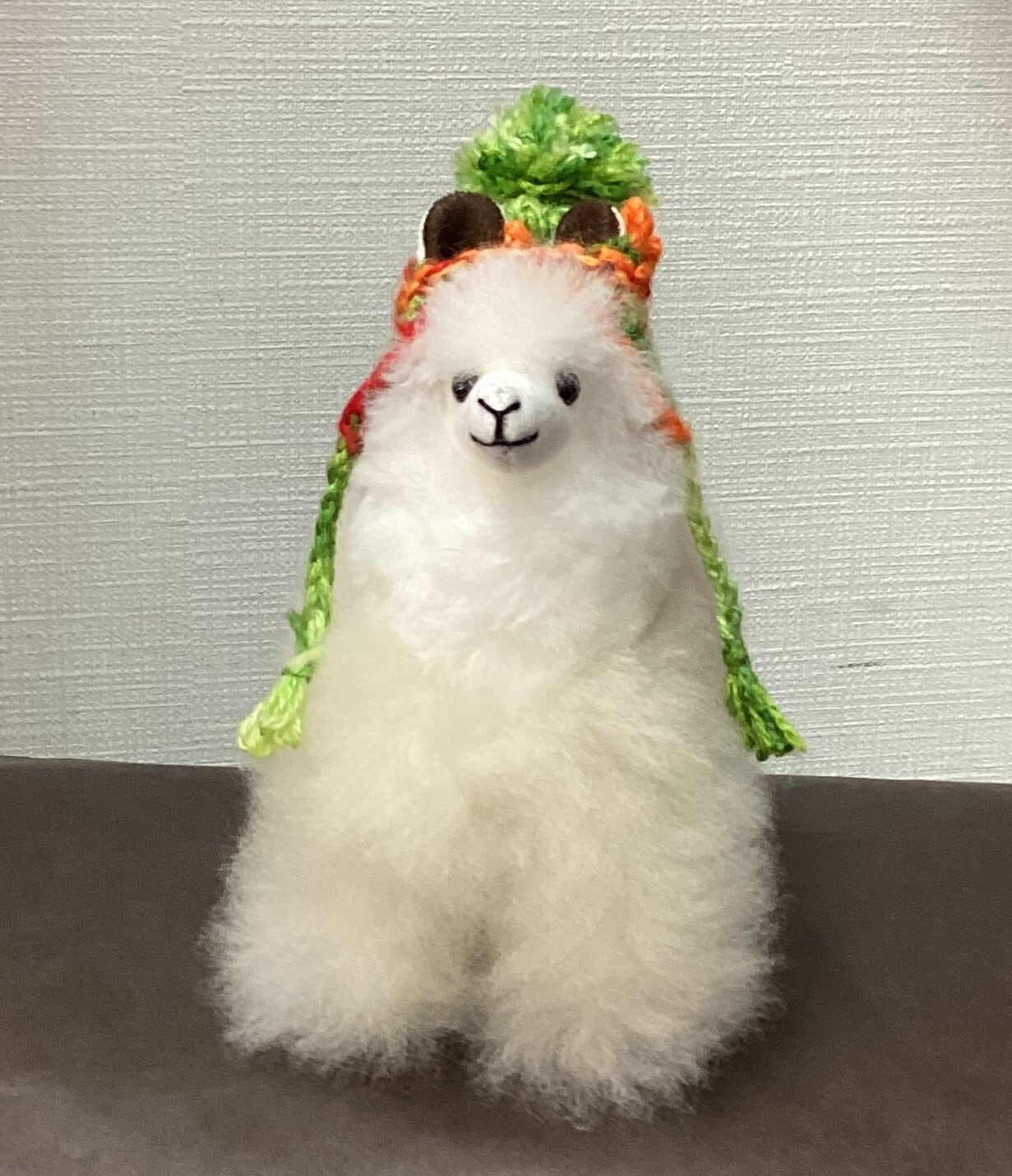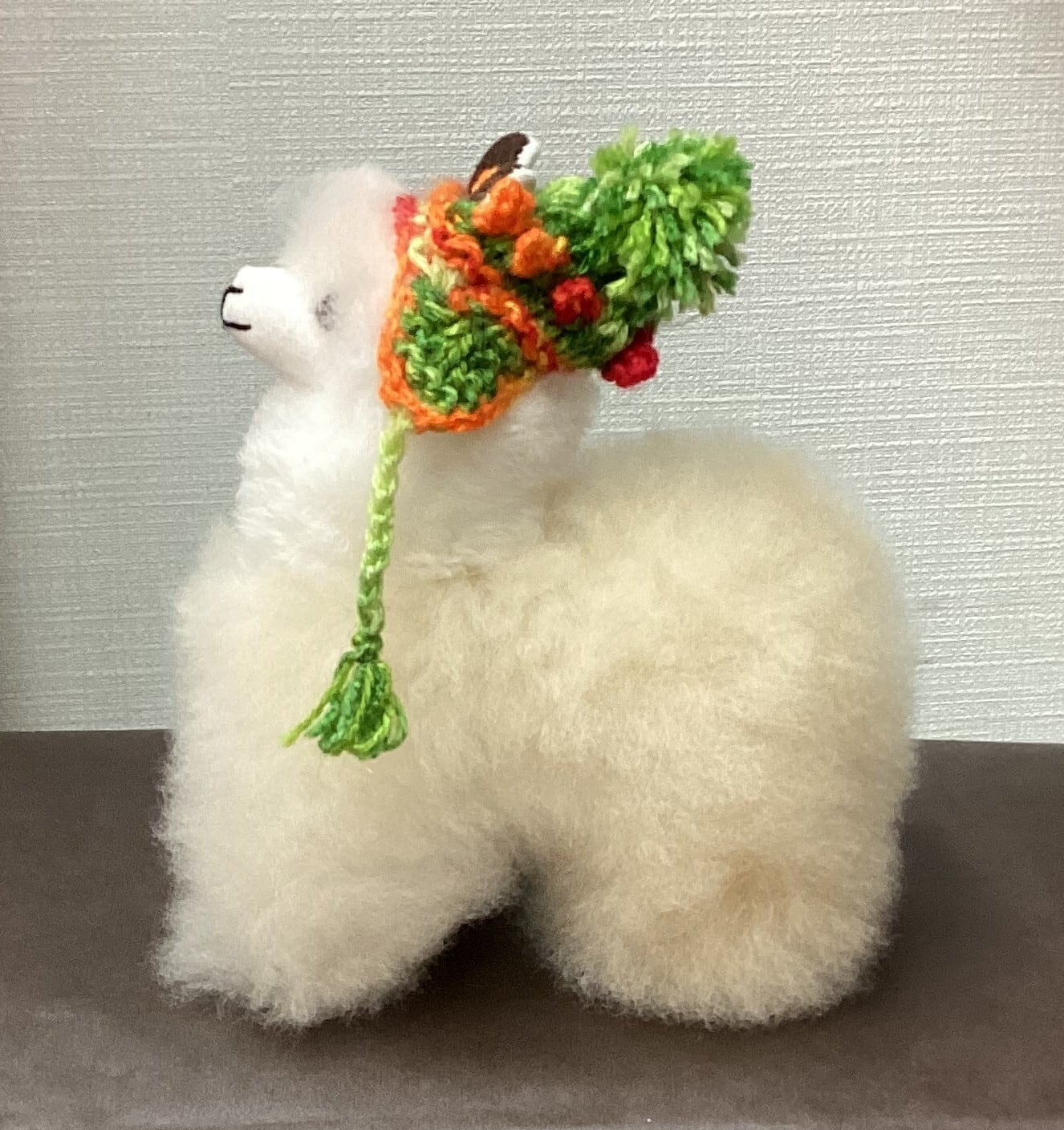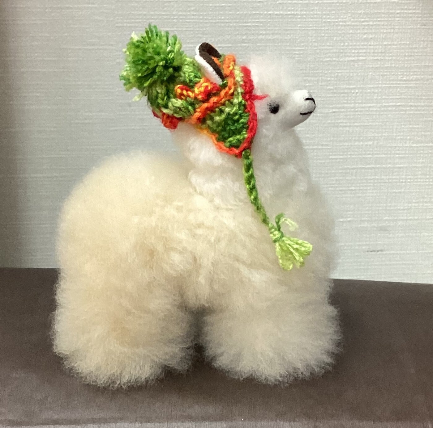 専用の帽子をかぶったアルパカ人形です。毛質はベビーアルパカ毛ですので驚くほどの柔らかさ。
